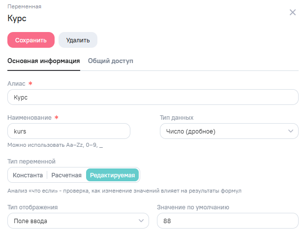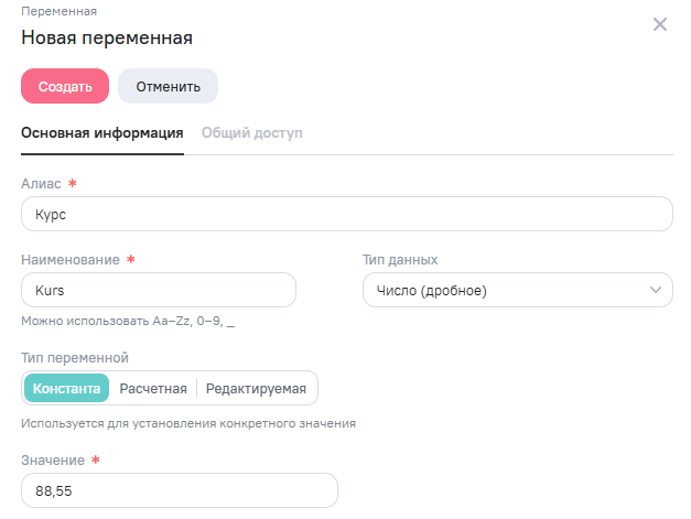 Пример настройки переменной типа Константа для расчета стоимости в рублях. При изменении курса не нужно будет менять значение во всех формулах, а нужно будет изменить только значение переменной.