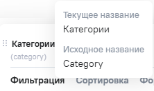 При наведении мышью на наименование поля, которое было изменено в виджете (в названии отображается (ред.)) - всплывает окно с текущим и исходным названием поля.