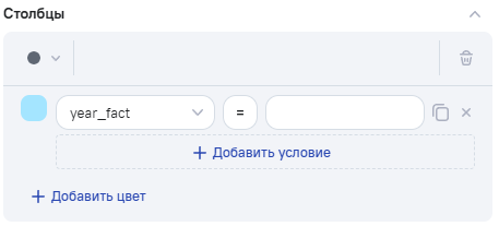 - выберите цвет и укажите условие по другому полю в блоках Столбцы/Агрегации/Группы, текущее поле, в котором происходит редактирование, будет окрашено в зависимости от условий на значения в другом поле;