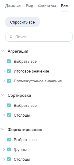 - блок Сортировка - содержит перечень полей и агрегаций данных по полям, для которых настроены правила сортировки. При наведении курсора мыши в строку записи поля, правее названия отображается информация о настроенном типе сортировки данных.