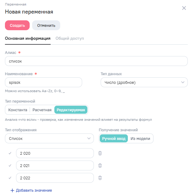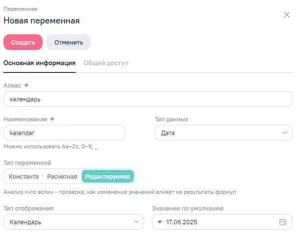 Откроется окно создания переменной. Окно состоит из двух вкладок: Основная информация и Общий доступ. Вкладка Общий доступ доступна только после заполнения полей на вкладке Основная информация и нажатия на кнопку Создать.