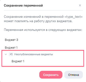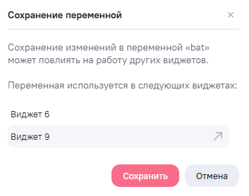 При сохранении переменной проверяются связанные объекты - виджеты. При наличии у переменной хотя бы одного связанного объекта, отобразится окно подтверждения сохранения. В окне сохранения отобразится список созданных пользователем связанных объектов. Нажав на наименование нужного объекта, выполняется переход к объекту в новом окне браузера. Чтобы подтвердить действие, нажмите на кнопку