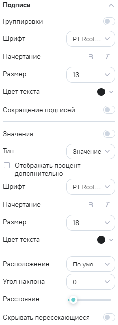 Расположение - выпадающий список с вариантами возможного расположения:по умолчанию- отображение подписей строго внутри диаграммы. Значение по умолчанию;справа;слева;сверху;снизу;