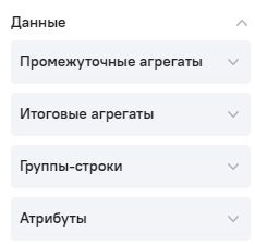 Настройка Данные включает следующие блоки: Промежуточные агрегаты, Итоговые агрегаты, Группы-строки, Атрибуты.