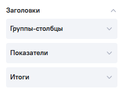 Настройка Заголовки включает следующие блоки: Группы-столбцы, Показатели, Итоги.