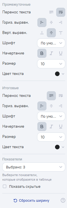 Сбросить ширину - активна после изменения настроек ширины показателей, позволяет вернуться к настройкам ширины по умолчанию, рассчитанным по данным модели;