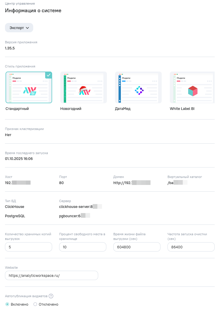Режим Автопубликация виджетов выбирается после установки или обновления системы и не подлежит изменению в процессе работы. Частая смена режима публикации виджетов может привести к некорректной работе виджетов и информационных панелей.