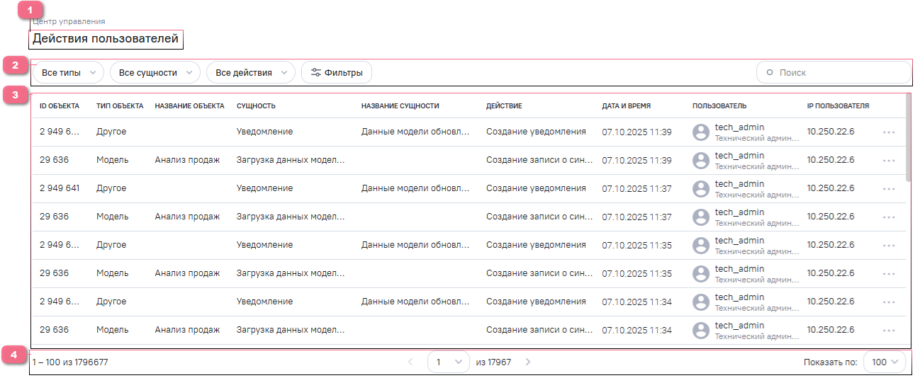 Для сотрудников службы DevOps и администраторов Системы доступна функциональность по просмотру действий пользователей в разделах Системы Источники данных, Модели, Виджеты, Информационные панели, Администрирование и Центр управления.