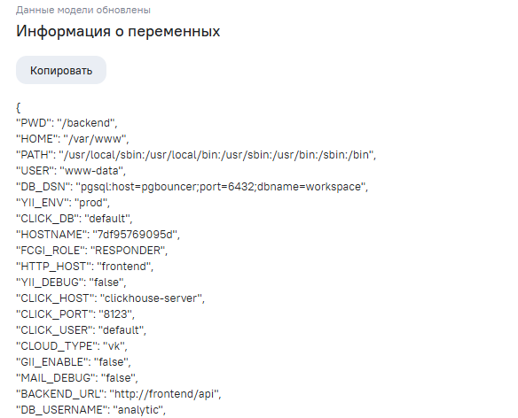 - Информация о переменных - при нажатии на кнопку открывается окно с информацией о переменных. В окне Информация о переменных отображается список переменных. Данные возможно скопировать, для этого нажмите на кнопку
