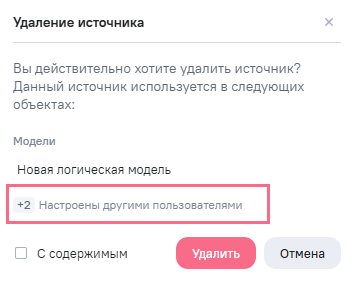 Если для источника созданы связанные объекты другими пользователями, то при удалении отобразится количество таких объектов в блоке Настроены другими пользователями. Объекты созданные другими пользователями не удалятся даже с включенной опцией С содержимым.