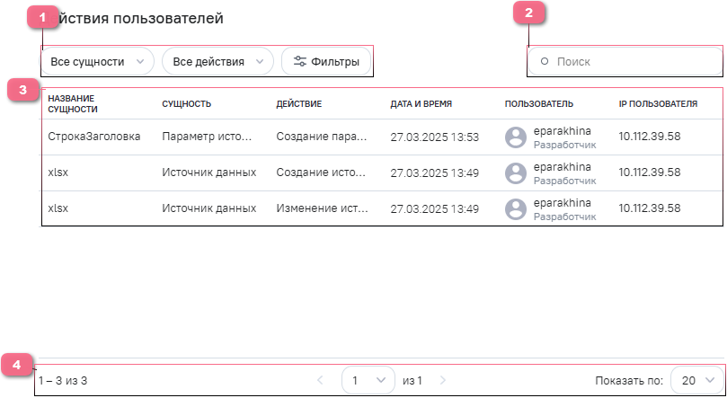 • Все действия - фильтр по действиям, совершенным с источником данных;