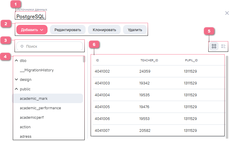 В источнике с типом PostgreSQL доступен просмотр данных материализованных представлений.