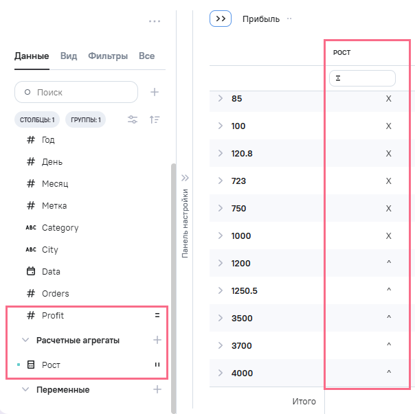 (рост), в Промежутоное значение указана формула IF [profit] > 1000 THEN CHAR (94)(1) ELSE CHAR (88)(2) END