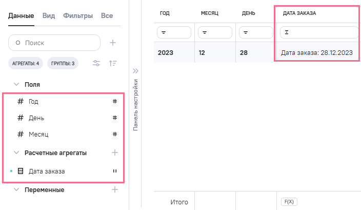 (дата заказа) определен как Агрегаты.