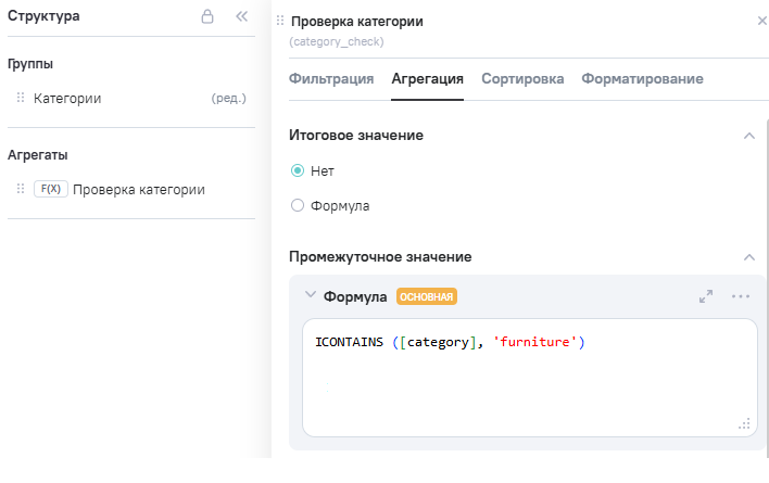 (проверка категории), в Промежутоное значение указана формула ICONTAINS ([category], 'furniture')