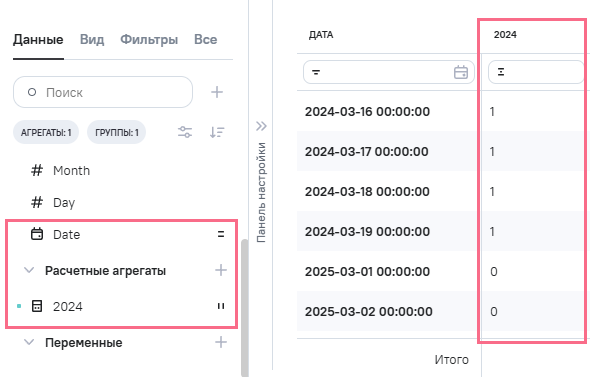 1.В виджете на вкладке Вид выбрана таблица агрегатов.