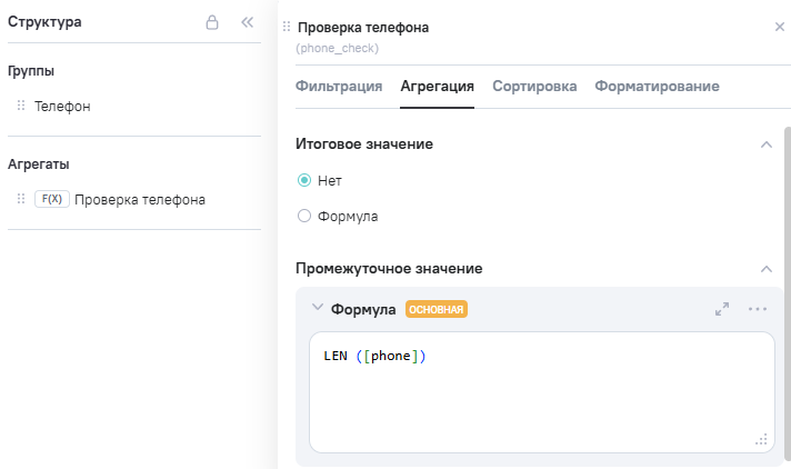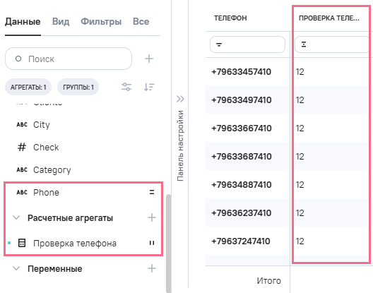 (телефон клиента), в Промежутоное значение указана формула RIGHT ([clients], 12)