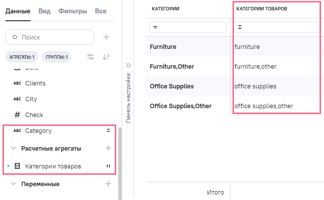 (категории товаров), в Промежутоное значение указана формула TRIM ([category])