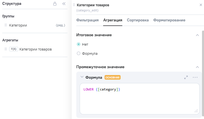 (категории товаров), в Промежутоное значение указана формула LOWER ([category])