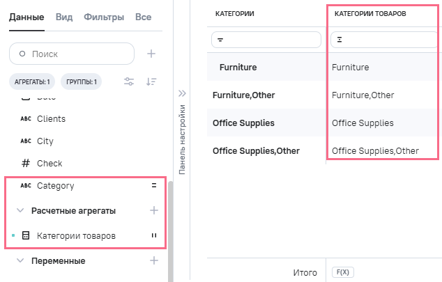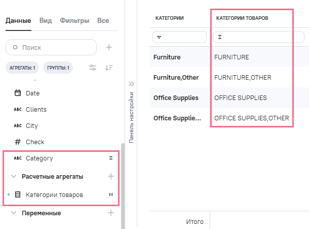 (категории товаров), в Промежутоное значение указана формула UTF8 ([category])