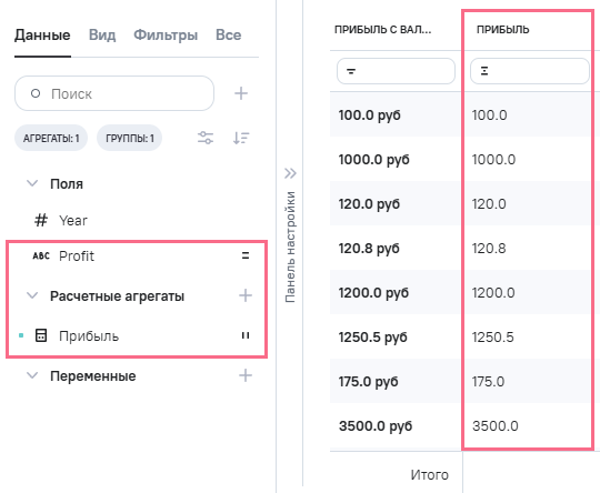 (прибыль), в Промежутоное значение указана формула REPLACE ([profit], 'руб','р.')