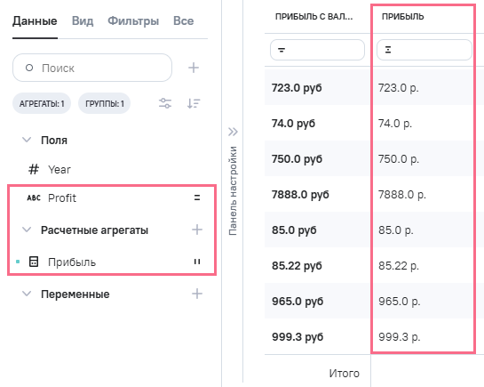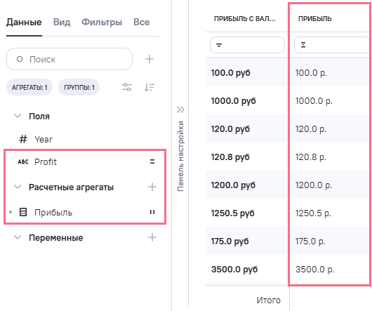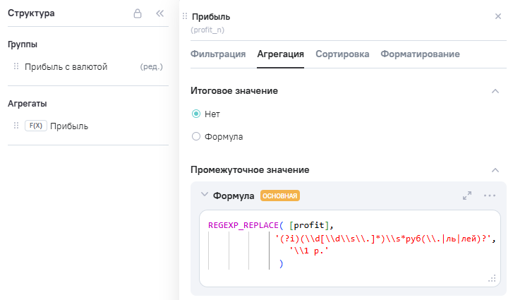 (прибыль), в Промежутоное значение указана формула REGEXP_REPLACE ([profit], '(?i)(\\d[\\d\\s\\.]*)\\s*руб(\\.|ль|лей)?','\\1 р.')(1)