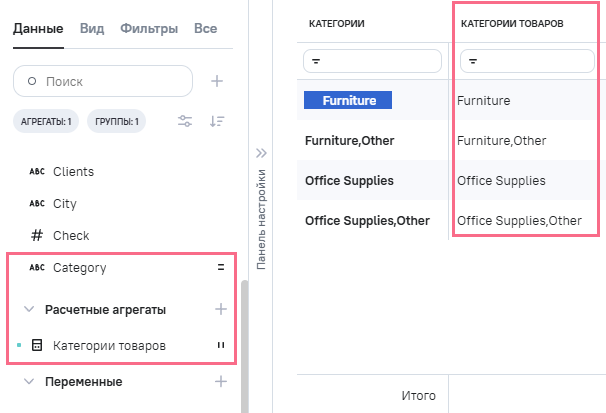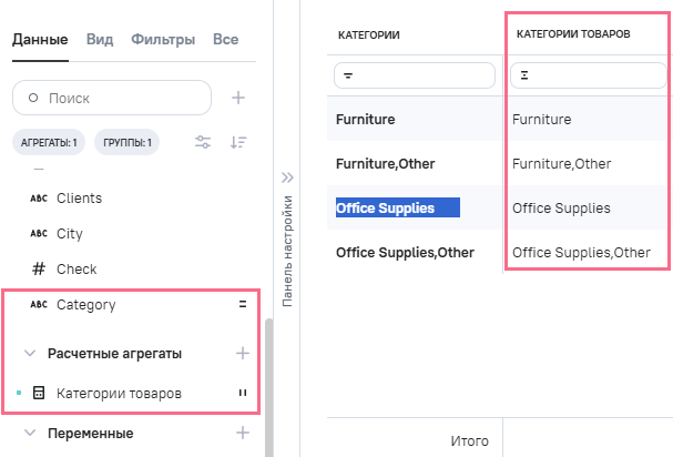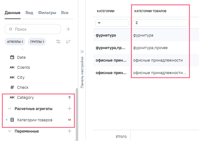 (категории товаров), в Промежутоное значение указана формула RTRIM ([category])