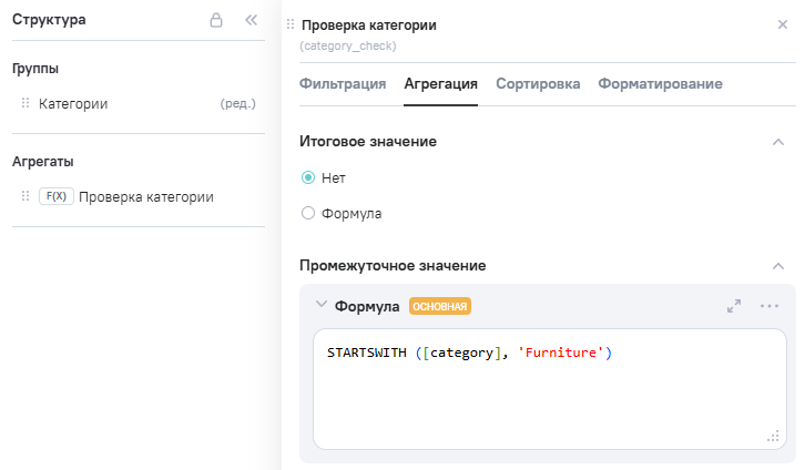 (проверка категории), в Промежутоное значение указана формула STARTSWITH ([category], 'Furniture')