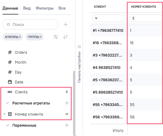 (номер клиента) определен как Агрегаты.