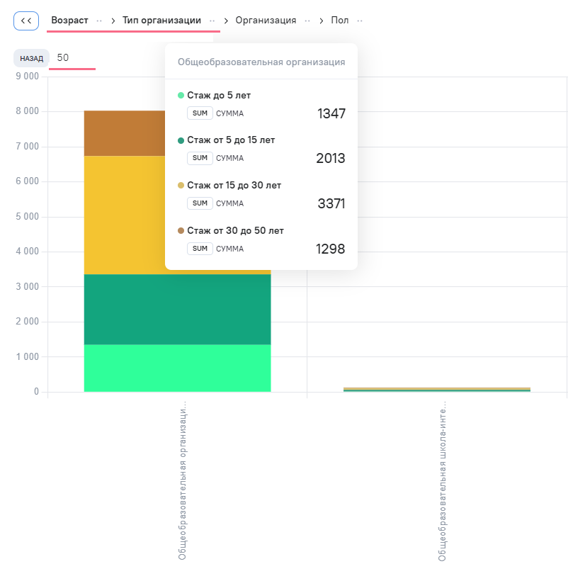 • отображение детальной информации (точных значений оси, показателя, вид его агрегации и названия показателя) при наведении курсора мыши на выбранный столбец;