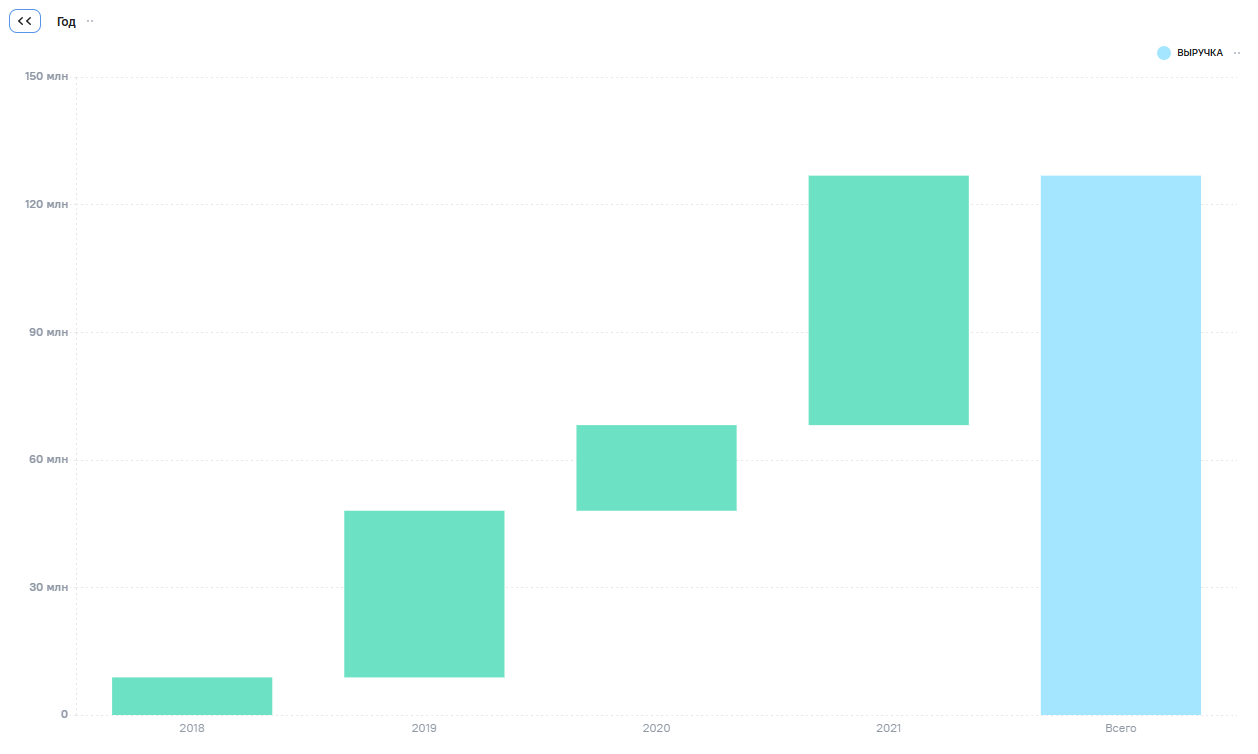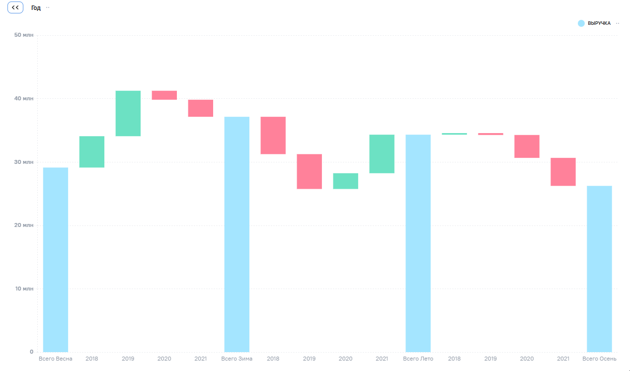Каскадная диаграмма — это тип диаграммы, который используется для визуализации последовательных изменений данных. Он показывает, из каких промежуточных агрегатов складывается итоговое значение, отображая изменения этих агрегатов в положительную или отрицательную сторону. Для построения диаграммы используется только один агрегат, например, сумма, среднее значение или количество. Построение виджета основывается на сводной таблице.