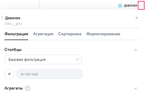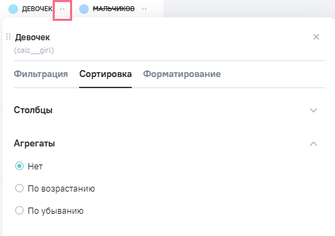 • настройка промежуточной и итоговой агрегации для показателей. Агрегация настраивается на вкладке Агрегация настроек поля. Промежуточную агрегацию также можно быстро изменить нажатием на иконку агрегации в структуре виджета. Подробнее об агрегации в разделе Параметры поля в структуре виджета;