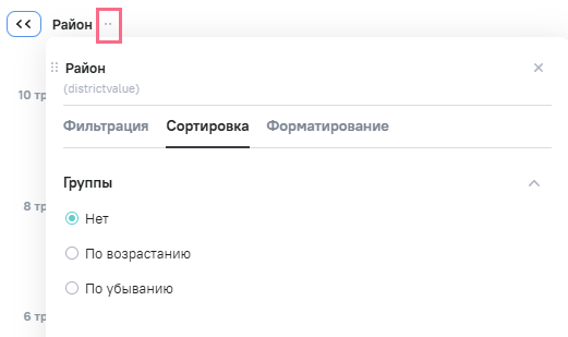 • настройка сортировки показателей диаграммы с помощью сортировки агрегированных данных и группировок по одному или нескольким полям, используемым в составе виджета. Сортировка настраивается на вкладке Сортировка настроек поля. Подробнее о сортировке в разделе Параметры поля в структуре виджета;