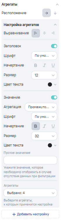 В зависимости от настроек Агрегаты в виджете KPI используются показатели по первой группе либо итоговые показатели. Доступны следующие настройки: