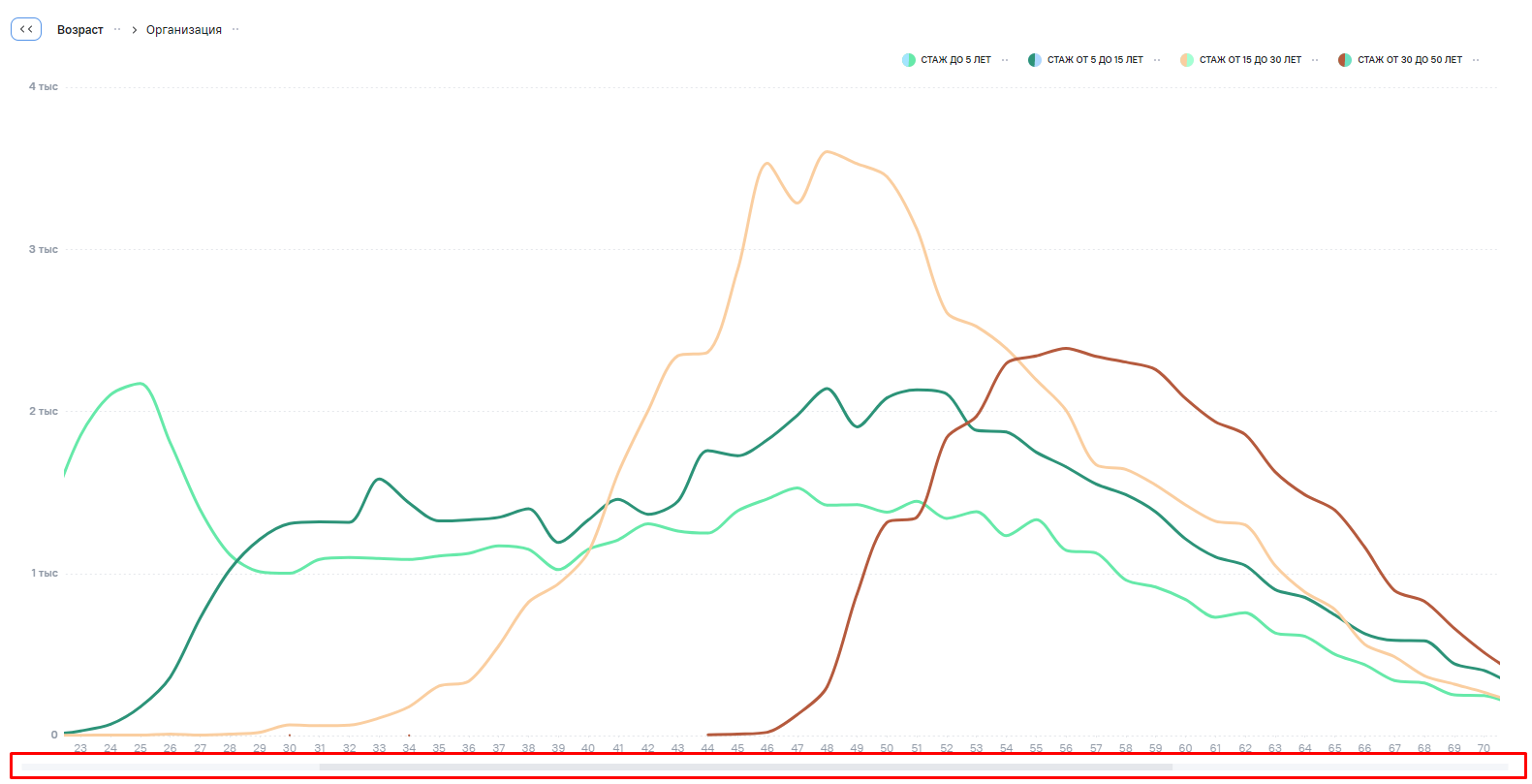изменение масштаба горизонтальной оси с помощью прокрутки колеса мыши увеличивая/уменьшая масштаб или разводя в стороны пальцы на планшете (жест pinch). После первичного увеличения масштаба на виджете появляется дополнительная возможность масштабирования - элемент скроллинга;