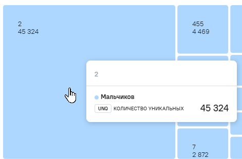 - просмотр детальной информации (названий, значений показателей и их вид агрегации) при наведении курсора мыши на выбранный сектор. В детальной информации отображается вид агрегации значения на диаграмме. При наведении курсора мыши на сегмент, он подсвечивается более темным цветом;
