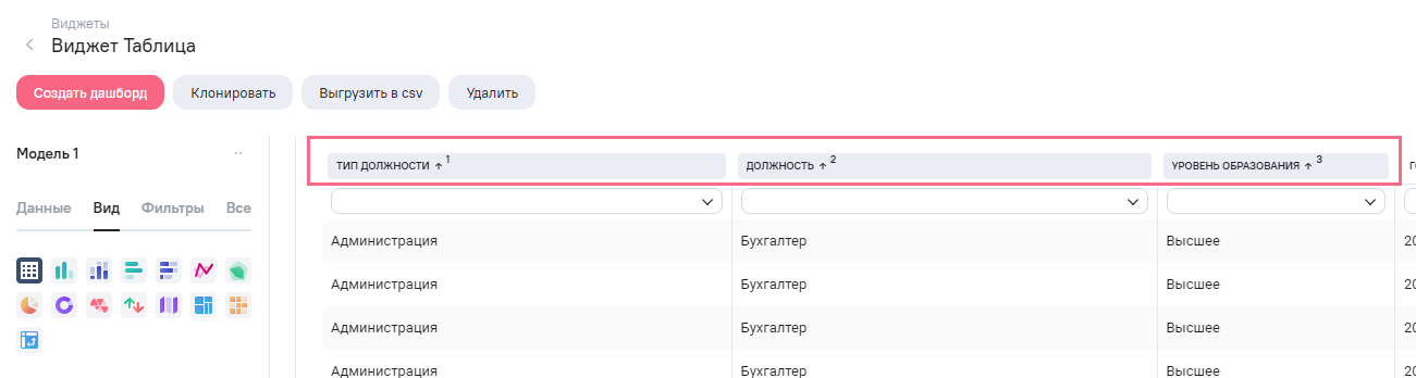 По умолчанию новый виджет имеет тип Таблица. Данные в таком виджете отображаются в виде таблицы.