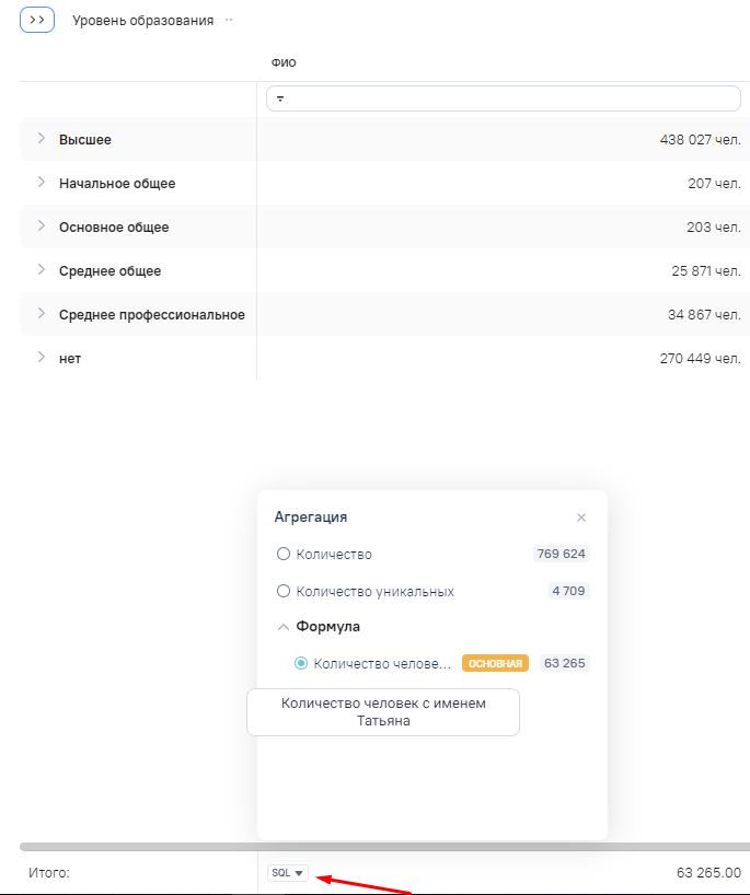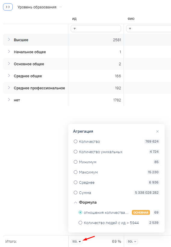 Для табличного виджета в режиме просмотра или редактирования у полей с настроенной итоговой агрегацией есть возможность изменить тип агрегации на любой доступный, нажав на пиктограмму с типом агрегации слева от итогового значения агрегата.