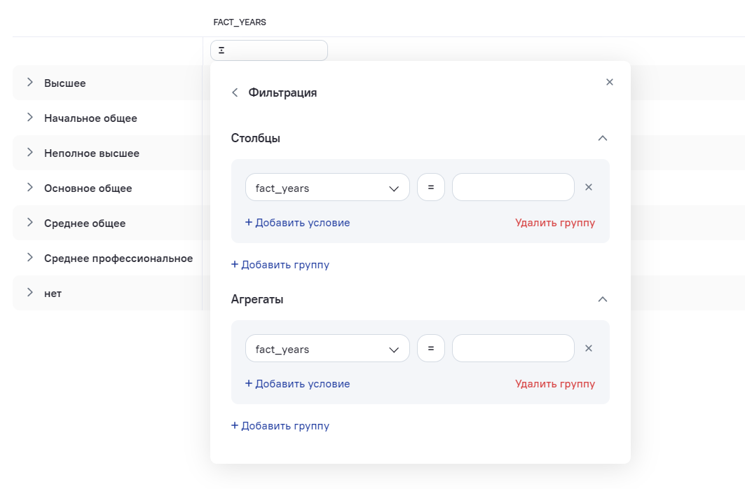 Фильтрация. В табличном представлении виджета выводится расширенная фильтрация для столбцов и агрегатов, по умолчанию блок Агрегаты свернут.
