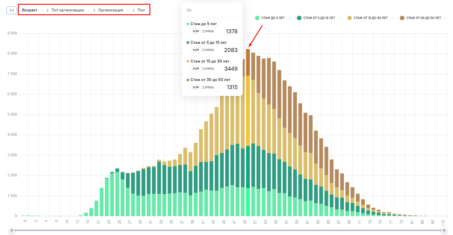 • раскрытие уровней группировок. При нажатии на наименование уровня в навигационной панели данные виджета раскроются до указанного уровня, свернуть группы-строки до любого предыдущего уровня можно повторным нажатием на наименование этого уровня;