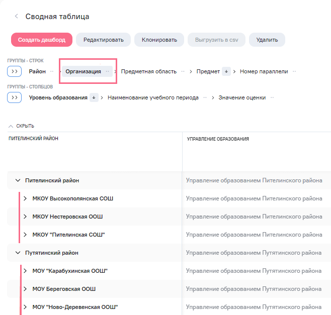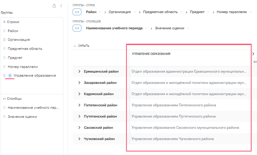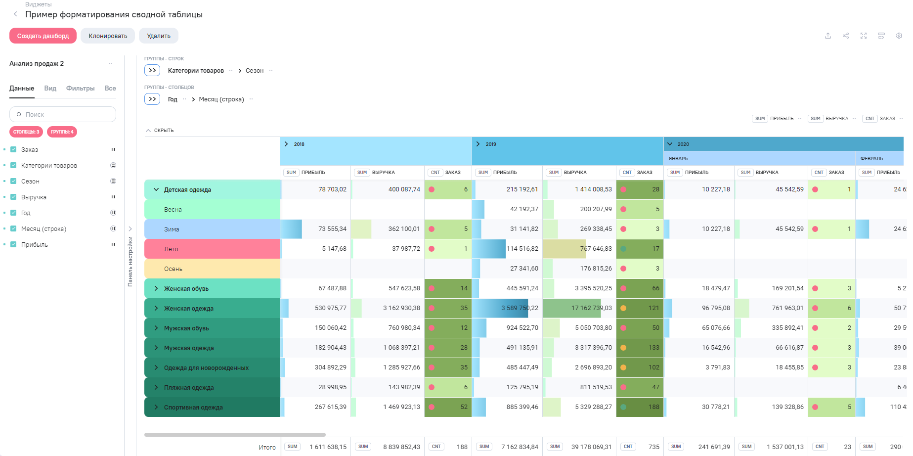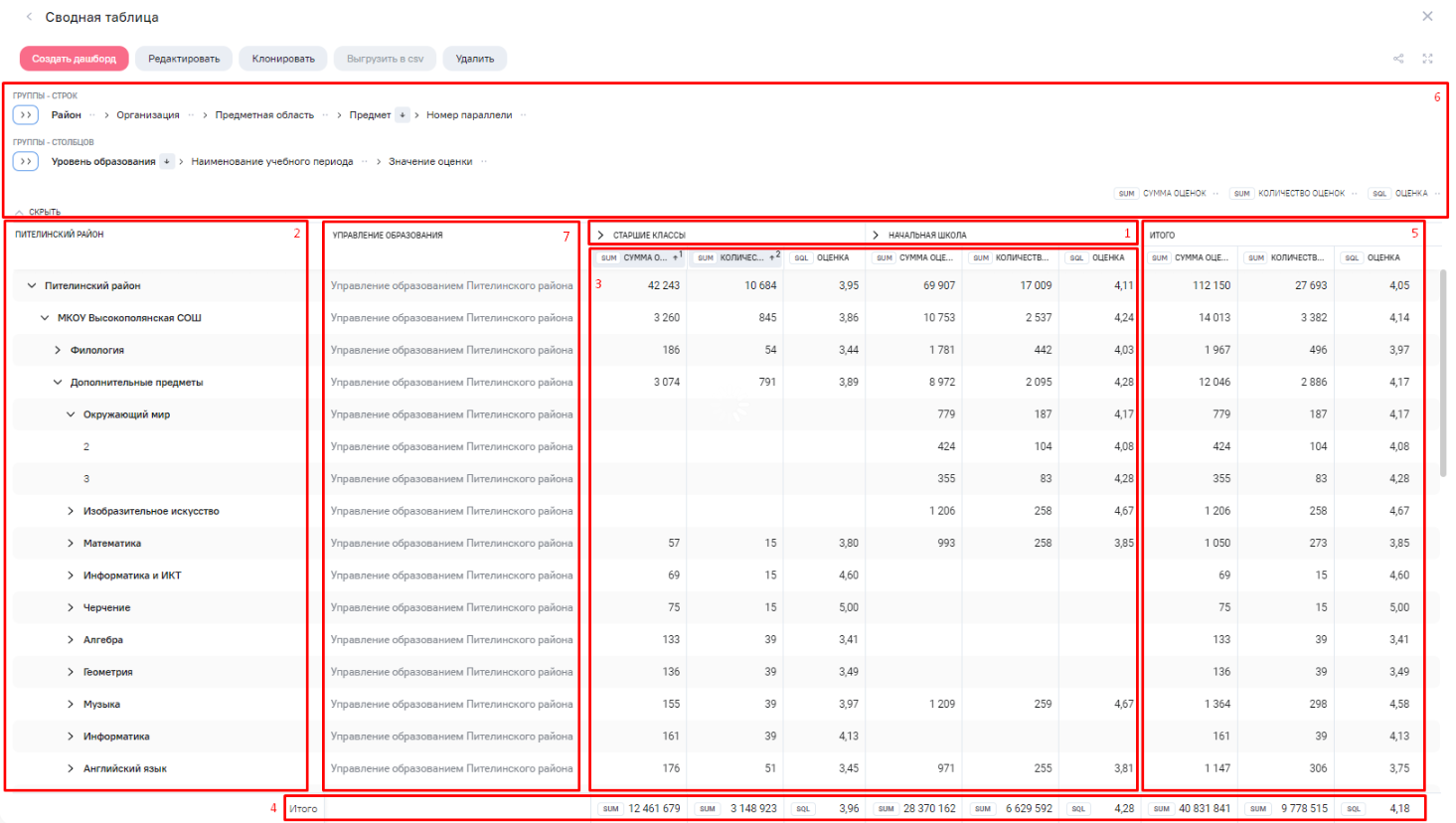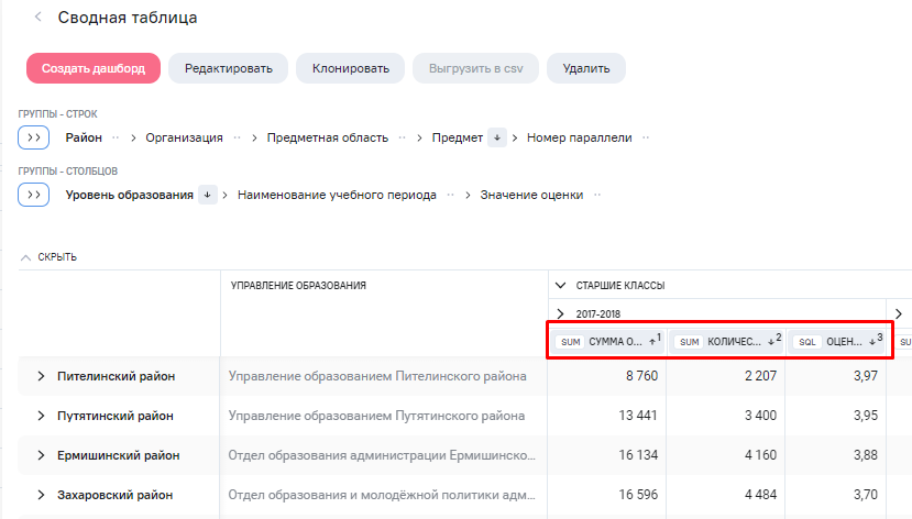 • каждое поле, добавленное в блок агрегаты/столбцы, попадает в область показателей. Если у поля настроена промежуточная и итоговая агрегация, то в области агрегированных данных отобразятся агрегаты поля в разрезе настроенных группировок.
