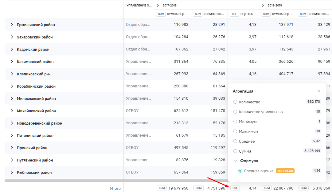 • смена итоговой агрегации - при нажатии на тег типа агрегации итогового значения открывается окно быстрого анализа;