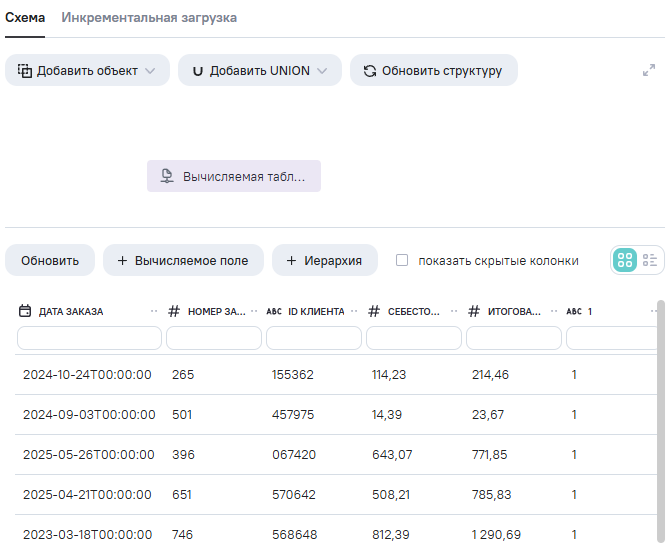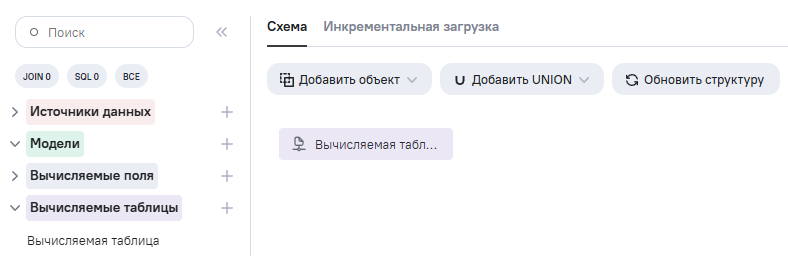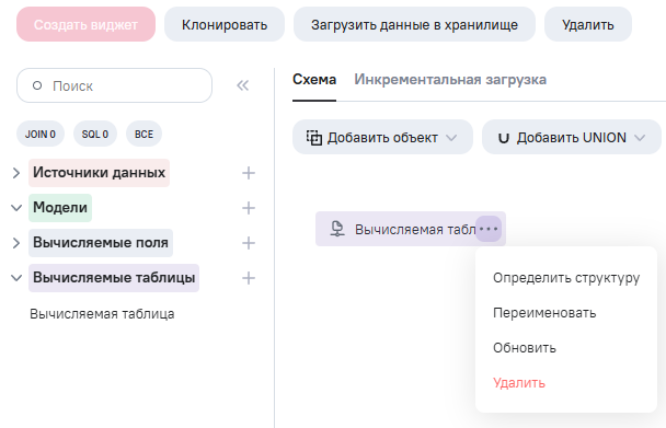 - Обновить - обновление структуры вычисляемой таблицы. Обновление структуры доступно только в контекстном меню в области схемы модели;