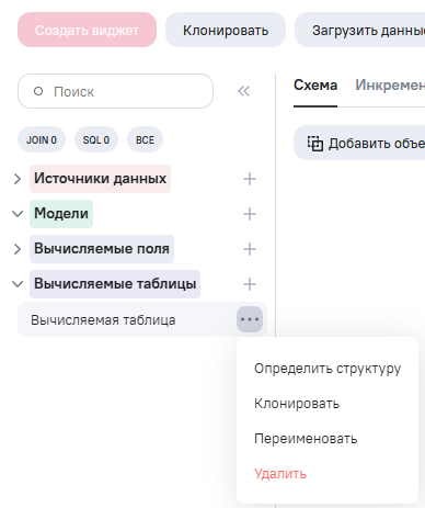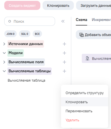 - Клонировать - создание копии вычисляемой таблицы. Клонирование доступно только в контекстном меню в блоке Вычисляемые таблицы;