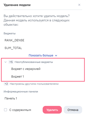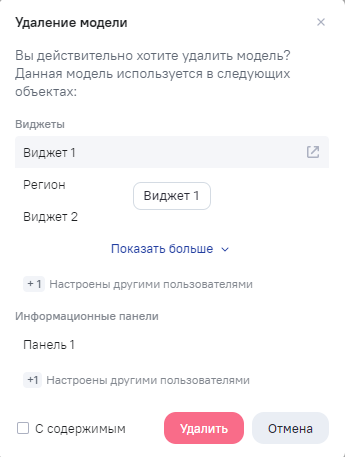 Если для виджета созданы связанные объекты другими пользователями, то при удалении отобразится количество таких объектов. Объекты созданные другими пользователями не удалятся даже с включенной опцией С содержимым.