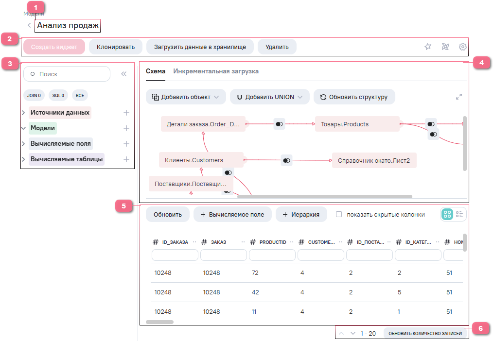 6.Панель с информацией о количестве строк данных в модели. Итоговые данные модели, определяются ее структурой. Данные модели доступны к предпросмотру в карточке модели, отображаются 20 строк. Если строк в модели меньше 20, то отображаются все строки.