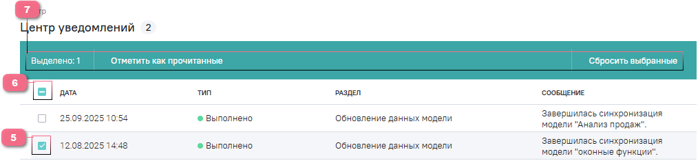 • надпись Выделено - отображается количество выбранных уведомлений;