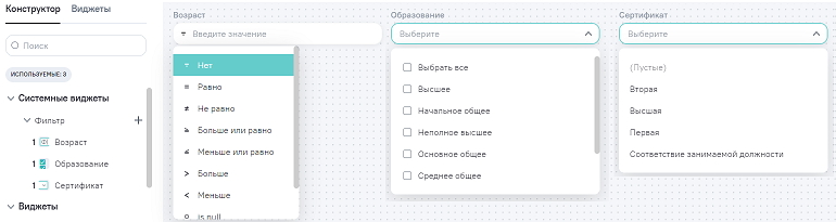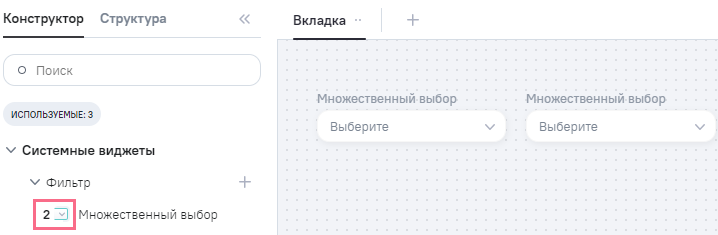 На вкладке Конструктор, в блоке Фильтр, будет отображаться счетчик количества используемых экземпляров одного и того же виджета. При повторном добавлении фильтра на панель счетчик увеличится на +1.