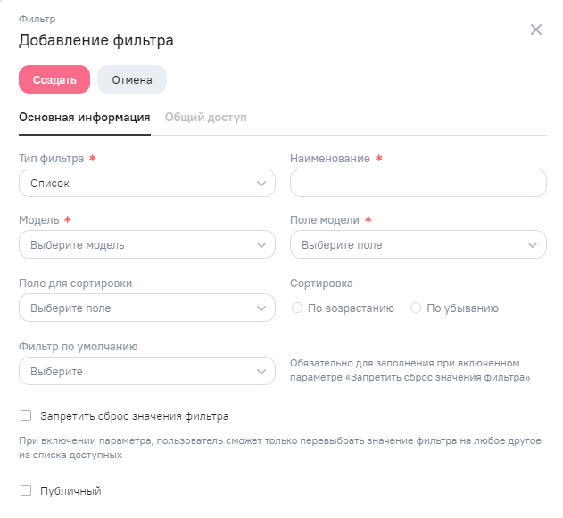 Фильтр по умолчанию - позволяет указать, какие значения будут стоять в фильтре по умолчанию. Фильтр по умолчанию меняется в зависимости от выбранного типа фильтра и поля модели: