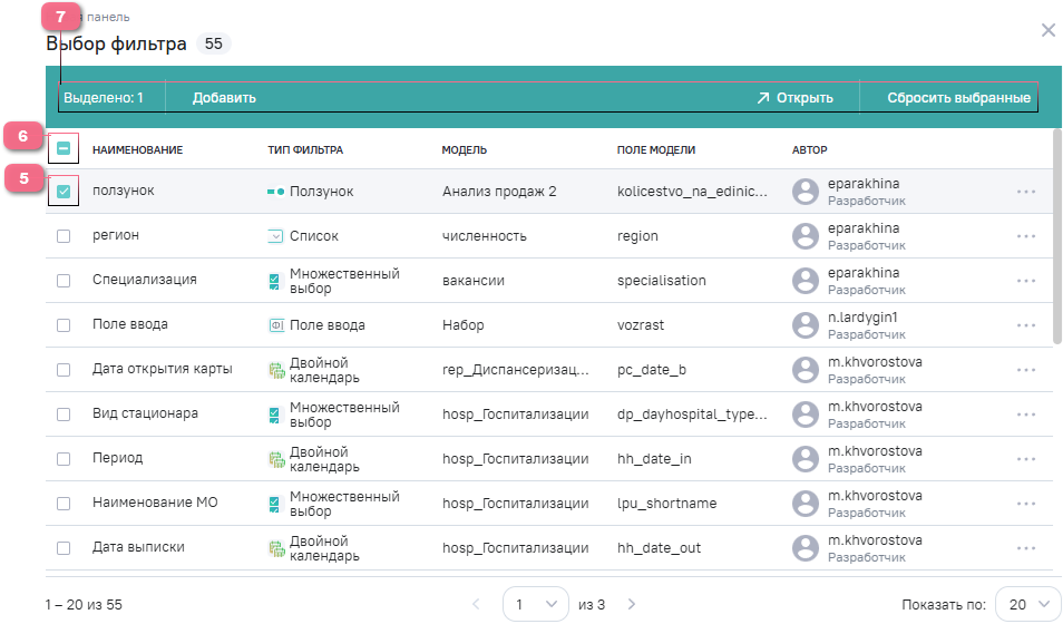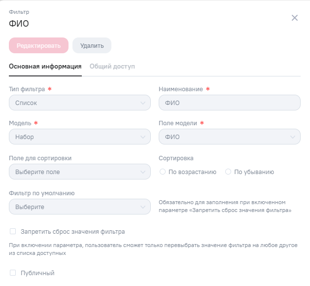 Удалить из списка - действие доступно на вкладке Конструктор. При удалении фильтра из списка удаляются все экземпляры виджетов с панели, но фильтр останется доступным для выбора через реестр фильтров. Публичный фильтр будет доступен на вкладке Конструктор даже после действия Удалить из списка;